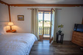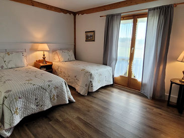 Room 5 offers a spacious layout with two comfortable single beds that can be converted into a king-sized bed upon request. The room also features a table for two, a storage closet, and a television. Garden doors open to a private balcony, complete with a table for two, offering breathtaking views of the Bay of Fundy, fields, forests, and stunning sunsets.